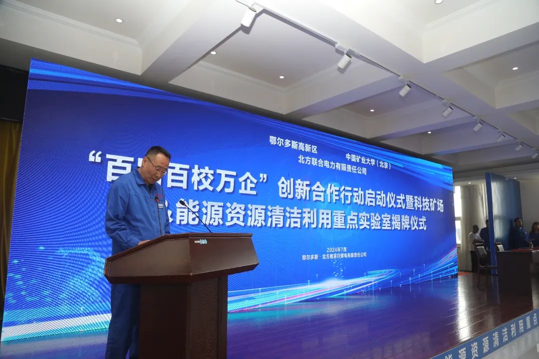 劉波在致辭中表示,能源資源清潔利用是關(guān)乎國家能源安全、生態(tài)環(huán)境保護和經(jīng)濟可持續(xù)發(fā)展的重大課題,也是中國礦業(yè)大學(北京)及內(nèi)蒙古研究院肩負的重要使命。此次揭牌簽約,將以“政、產(chǎn)、學、研、用”的深度融合,催生更多產(chǎn)業(yè)科技合作碩果,推動“園區(qū)+高校+企業(yè)”合作邁上新臺階、開辟新境界。他表示,“科技礦場”和“能源資源清潔利用重點實驗室”的成立,是雙方優(yōu)勢互補、資源共享的結(jié)晶。雙方秉持培養(yǎng)“家國情懷、精英素養(yǎng)、能源特質(zhì)”的高素質(zhì)創(chuàng)新人才育人理念,將“科技礦場”建設(shè)成“思政育人基地”“創(chuàng)新實踐基地”“實習實訓基地”“人才就業(yè)基地”四位一體的人才培養(yǎng)綜合平臺,努力構(gòu)建人才培養(yǎng)、科技創(chuàng)新、社會服務(wù)有機結(jié)合的實踐育人模式,打造實踐育人新范式。華能集團與學校有著深厚合作基礎(chǔ),北方聯(lián)合電力有限責任公司為學校及內(nèi)蒙古研究院提供了寶貴實際應(yīng)用場景,使科學研究更加貼近市場需求,具有針對性和實效性,實現(xiàn)一流科技支撐服務(wù),服務(wù)一流成果轉(zhuǎn)化應(yīng)用,助力一流校企發(fā)展。