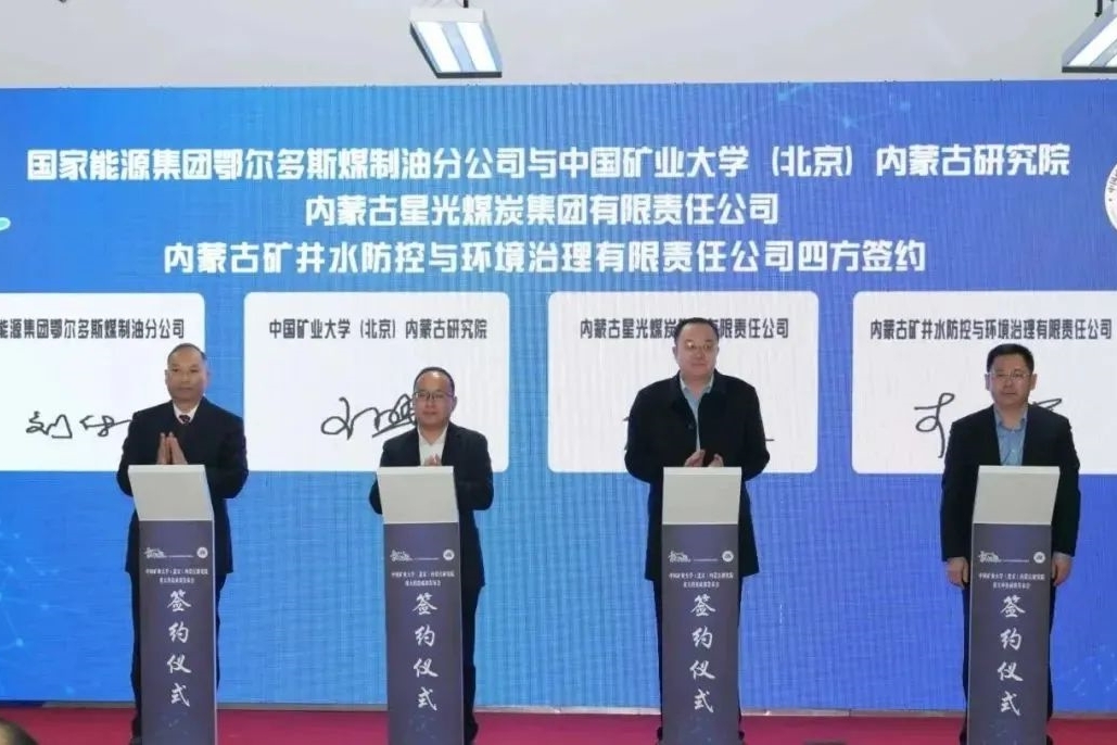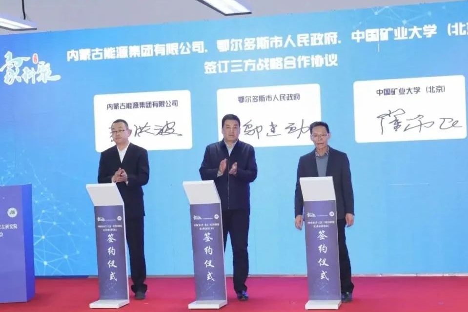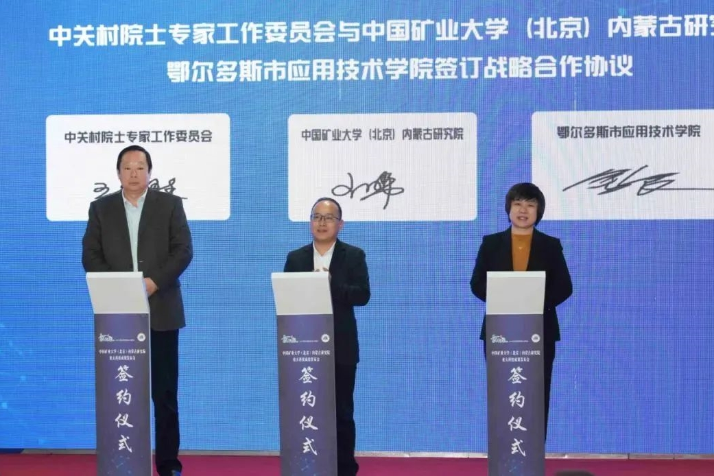 會上,鄂爾多斯市人民政府、中國礦業大學(北京)、內蒙古能源集團有限公司三方簽署了戰略合作協議。中國礦業大學(北京)內蒙古研究院與鄂爾多斯市應用技術學院、中關村院士專家工作委員會、國家能源集團鄂爾多斯煤制油分公司、內蒙古星光煤炭集團有限責任公司、內蒙古礦井水防控與環境治理有限責任公司簽訂了戰略合作協議。相關負責人為入駐中國礦業大學(北京)內蒙古研究院企業揭牌。