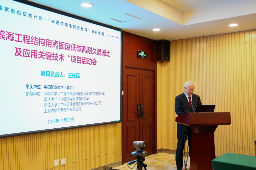 本網(wǎng)訊 2月22日上午,由中國(guó)礦業(yè)大學(xué)(北京)作為牽頭承擔(dān)單位,我校王棟民教授主持的“十四五”國(guó)家重點(diǎn)研發(fā)計(jì)劃項(xiàng)目“濱海工程結(jié)構(gòu)用高固廢低碳高耐久混凝土及應(yīng)用關(guān)鍵技術(shù)”(編號(hào)2024YFB3714800)啟動(dòng)會(huì)暨實(shí)施方案論證會(huì)在北京召開(kāi)。項(xiàng)目責(zé)任專家華北理工大學(xué)校長(zhǎng)張福成院士、蘇州實(shí)驗(yàn)室祝偉麗教授級(jí)高工,評(píng)審專家東南大學(xué)繆昌文院士、中國(guó)建筑材料科學(xué)研究總院有限公司郅曉董事長(zhǎng)、武漢理工大學(xué)副校長(zhǎng)王發(fā)洲、中科院過(guò)程工程研究所循環(huán)經(jīng)濟(jì)技術(shù)中心主任李會(huì)泉教授、清華大學(xué)孔祥明教授,顧問(wèn)專家重慶大學(xué)周緒紅院士、楊永斌院士、中國(guó)礦業(yè)大學(xué)(北京)武強(qiáng)院士、深圳大學(xué)陳湘生院士出席會(huì)議。中國(guó)礦業(yè)大學(xué)(北京)校長(zhǎng)劉波、副校長(zhǎng)崔希民,科學(xué)技術(shù)研究院、化學(xué)與環(huán)境工程學(xué)院相關(guān)負(fù)責(zé)人,項(xiàng)目及各課題負(fù)責(zé)人、相關(guān)專家、研究骨干等40余人出席會(huì)議。張福成院士任評(píng)審專家組組長(zhǎng)。崔希民主持會(huì)議。