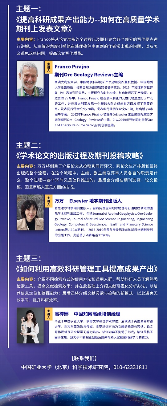 為進一步推進探究式學(xué)習(xí)能力培養(yǎng)與學(xué)術(shù)寫作能力,幫助教師提升信息化教學(xué)能力與水平,引導(dǎo)教師向?qū)W術(shù)型、科研型的轉(zhuǎn)變,助力教師有效開展在線教學(xué),中國礦業(yè)大學(xué)(北京)特邀期刊Ore Geology Reviews主編Franco Pirajno、Elsevier地學(xué)期刊出版人萬萬帶來科研人員高質(zhì)量科研成果產(chǎn)出能力提升方法培訓(xùn)。